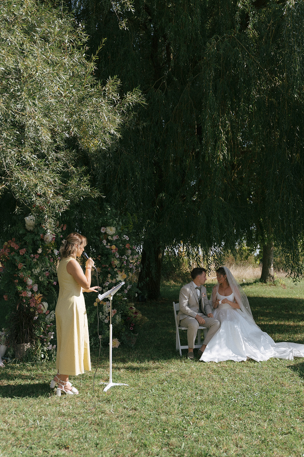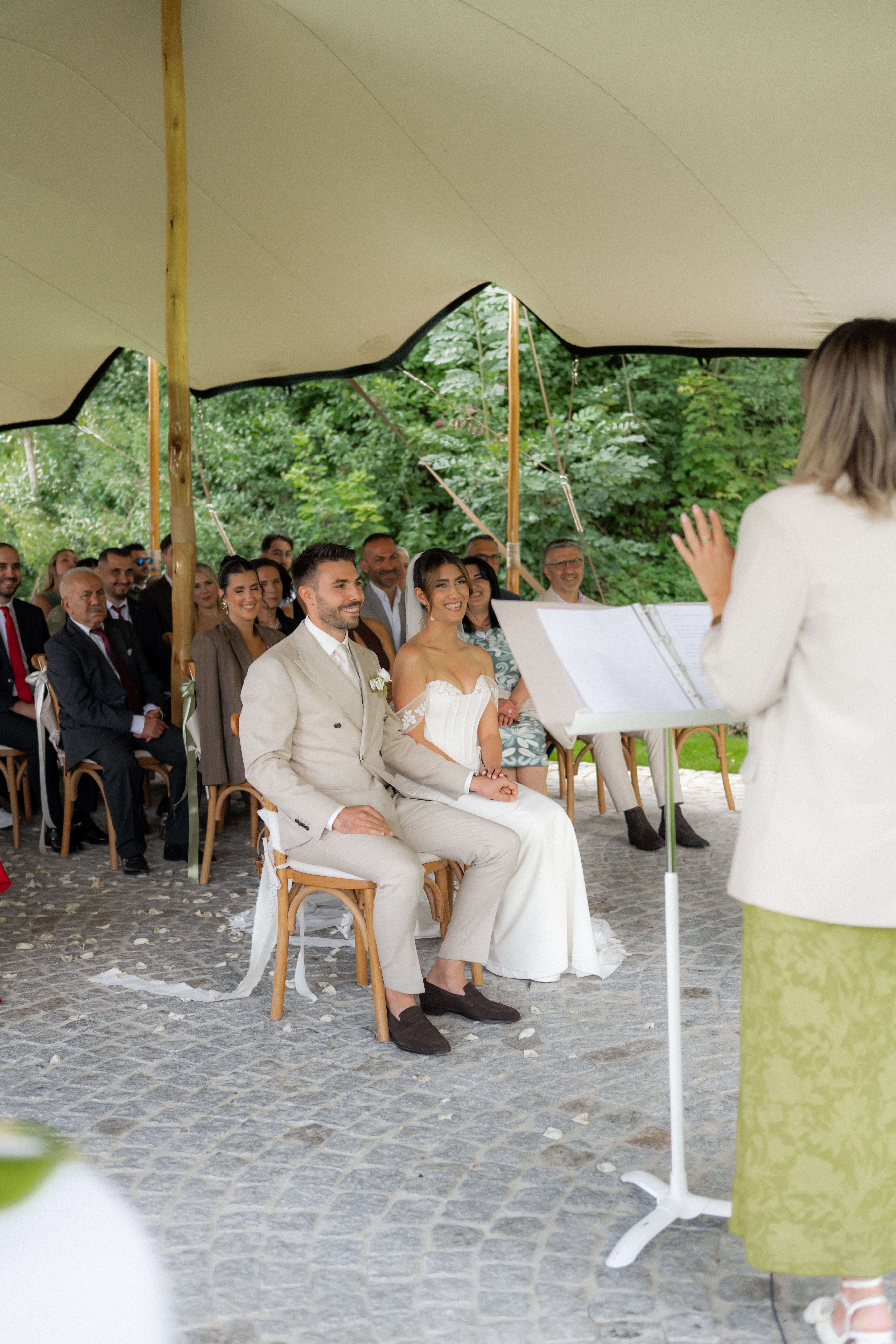 Das Wetter zeigte sich unbeständig, doch unter dem stilvollen Zelt konnte die freie Trauung dennoch inmitten der Natur stattfinden. Diese freie Trauung vereinte nicht nur zwei Menschen, sondern auch zwei Kulturen. Damit jeder Gast diesen besonderen Moment miterleben konnte, wurden Handouts in mehreren Sprachen gestaltet. Eine Geste, die nicht nur Verständnis schuf, sondern Verbundenheit – denn Liebe spricht alle Sprachen.