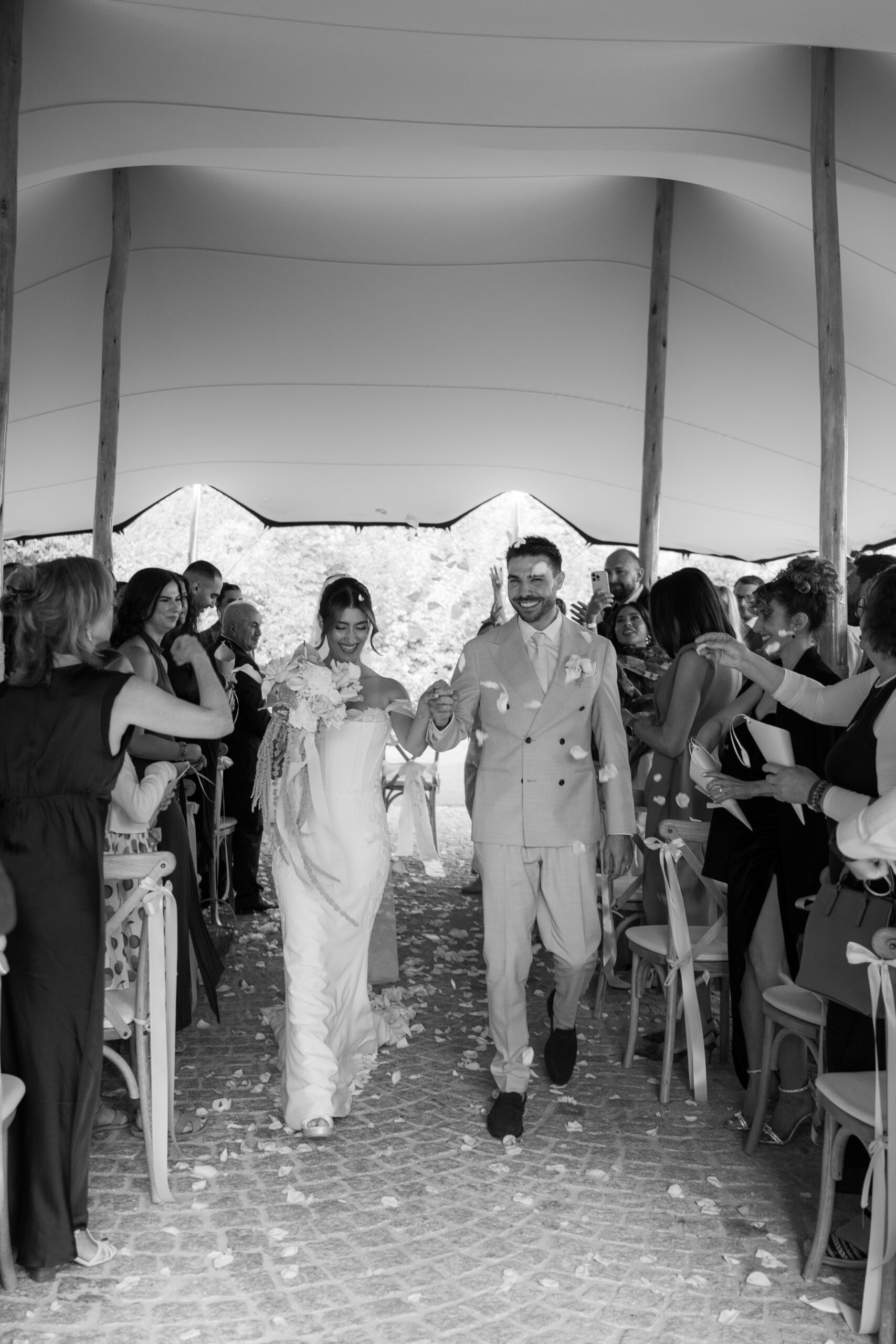 Es war einer dieser Tage in der Toskana, an denen der Himmel einfach sein eigenes Ding macht. Statt Sonne gab es Regenschauer – und plötzlich war Plan B nicht nur eine Option, sondern unser treuer Begleiter. Genau dort entstand ihr emotionalstes Highlight: ihre freie Trauung. Die Familie und Gäste wurden liebevoll eingebunden, und die Eheversprechen der beiden waren die Krönung.